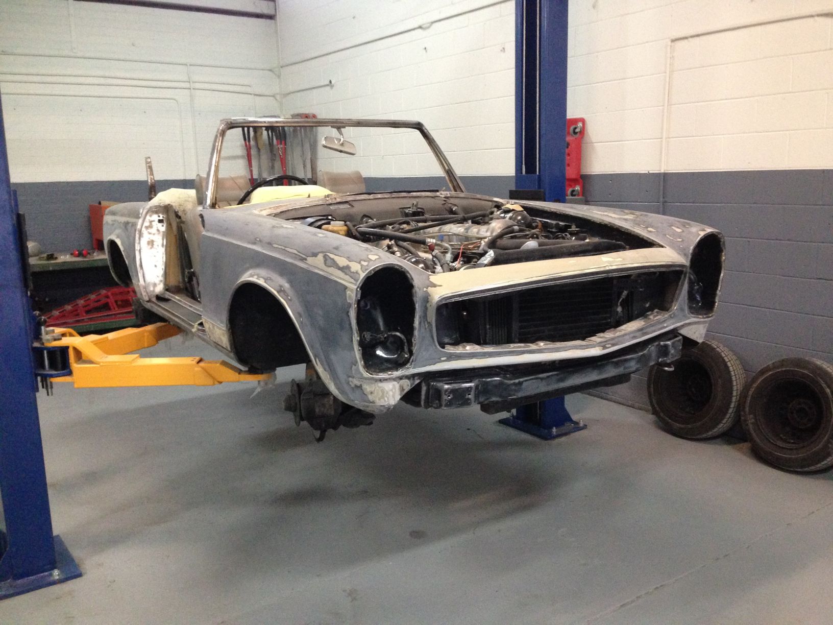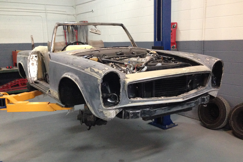 The 250SL Pagoda experienced significant paint defects from a previous repair >10 years ago.